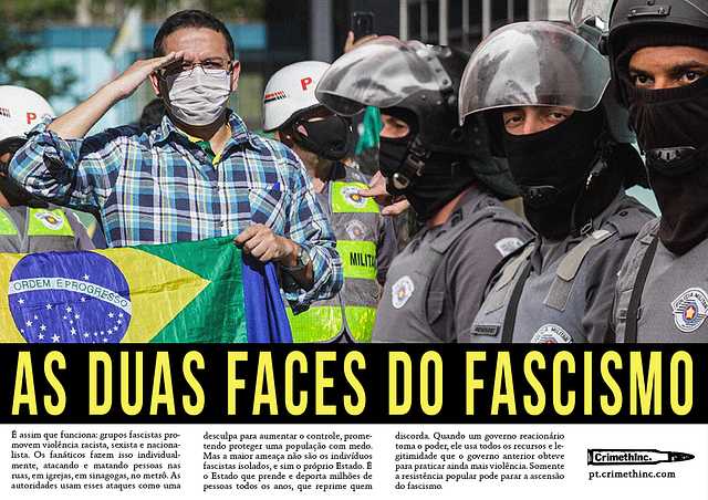 Quando fascistas tomam as ruas com seus símbolos e até armas em mãos, a polícia protege seu “direito à liberdade de expressão” e os escoltam para que atuem em segurança. Quando antifascistas tentam impedir que a extrema direita consiga recrutar mais gente com seus discursos, a polícia ataca e busca criminalizar sua ação política. Mesmo sabendo que carregar símbolos e imagens neo-nazistas é considerado crime, as autoridades vão sempre optar por criminalizar a resistência e tolerar o fascismo.