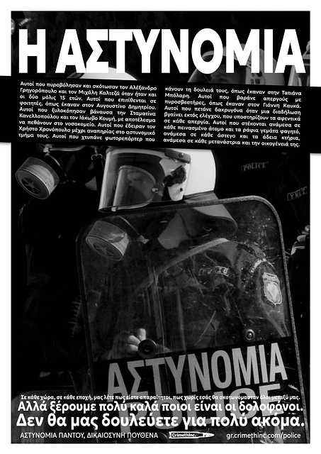 Αυτοί που πυροβόλησαν και σκότωσαν τον Αλέξανδρο Γρηγορόπουλο και τον Μιχάλη Καλτεζά όταν ήταν και οι δύο μόλις 15 ετών. Αυτοί που επιτίθενται σε φοιτητές, όπως έκαναν στον Αυγουστίνο Δημητρίου. Αυτοί που ξυλοκόπησαν βάναυσα την Σταματίνα Κανελλοπούλου και τον Ιάκωβο Κουμή, με αποτέλεσμα να πεθάνουν στο νοσοκομείο. Αυτοί που έδειραν τον Χρήστο Χρονόπουλο μέχρι αναπηρίας στο αστυνομικό τμήμα τους. Αυτοί που χτυπάνε φωτορεπόρτερ που κάνουν τη δουλειά τους, όπως έκαναν στην Τατιάνα Μπόλαρη. Αυτοί που βαράνε απεργούς με πυροσβεστήρες, όπως έκαναν στον Γιάννη Καυκά. Αυτοί που πετάνε δακρυγόνα όταν μια διαδήλωση βγαίνει εκτός ελέγχου, που υποστηρίζουν τα αφεντικά σε κάθε απεργία. Αυτοί που στέκονται ανάμεσα σε κάθε πεινασμένο άτομο και τα ράφια γεμάτα φαγητό, ανάμεσα σε κάθε άστεγο και τα άδεια κτήρια, ανάμεσα σε κάθε μετανάστρια και την οικογένειά της.