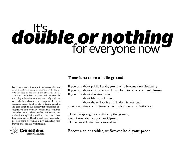 To be an anarchist means to recognize that our freedom and well-being are inextricably bound up with the freedom and well-being of billions like us. It means discarding all the old excuses for remaining subservient to those who only endeavor to enrich themselves at others’ expense. It means becoming fiercely loyal to what is best in ourselves and each other, to our capacity for compassion and cooperation and courage. Across two centuries, anarchists have resisted under monarchies and persisted through dictatorships. Now that liberal democracy and neoliberal capitalism are concluding in a new form of tyranny, a new generation must draw on this long legacy of struggle.