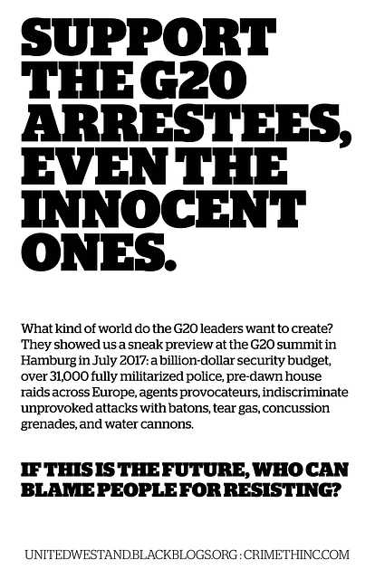 What kind of world do the G20 leaders want to create? They showed us a sneak preview at the G20 summit in Hamburg in July 2017: a billion-dollar security budget, over 31,000 fully militarized police, pre-dawn house raids across Europe, agents provocateurs, indiscriminate unprovoked attacks with batons, tear gas, concussion grenades, and water cannons.