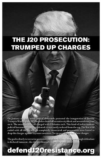 On January 20, 2017, while tens of thousands protested the inauguration of Donald Trump in Washington, DC, the police closed off an entire city block and arrested everyone on it. The arrestees were all charged with 8 felonies each. This kind of indiscriminate judicial harassment is unprecedented; it was surely ordered from the top. The first trial ended with all the defendants completely exonerated and prosecutors were forced to drop the charges against 129 more arrestees. Yet 59 people still face these charges.
