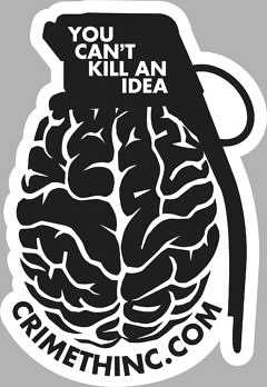›You Can’t Kill An Idea‹ , steht auf dem Zünder einer Granate mit einem Gehirn als Ladung und einem Körper. Die URL crimethinc.com steht in einem Bogen unter dem Gehirn.